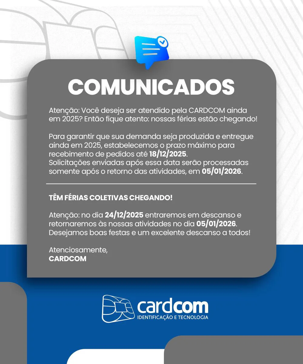 Há mais de 20 anos no mercado, a Cardcom é especializada no fornecimento de crachás, cartões, acessórios, envelopamento e manuseio. Localizada em Belo Horizonte, Minas Gerais, é líder no seu segmento. Trabalhamos com tecnologia de ponta para antecipar às necessidades do mercado e dos nossos clientes